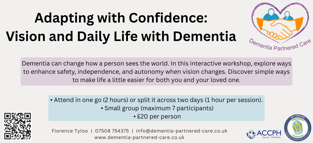 By understanding how visual changes affect daily life, you’ll be able to create an environment that naturally promotes safety and participation. This not only reduces stress, but also gives you back time and emotional energy — allowing your relationship to take centre stage rather than care tasks.